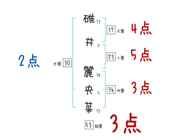 総運![]() | 碓井麗央菜さんの総運は53画の3つ星!やや見栄っ張りで虚栄心がある。散財に注意。 あなたの人生を表す1番重要な運勢です。生涯を通じて影響する総合運となり、主に50歳以降の晩年期に影響を及ぼします。 |