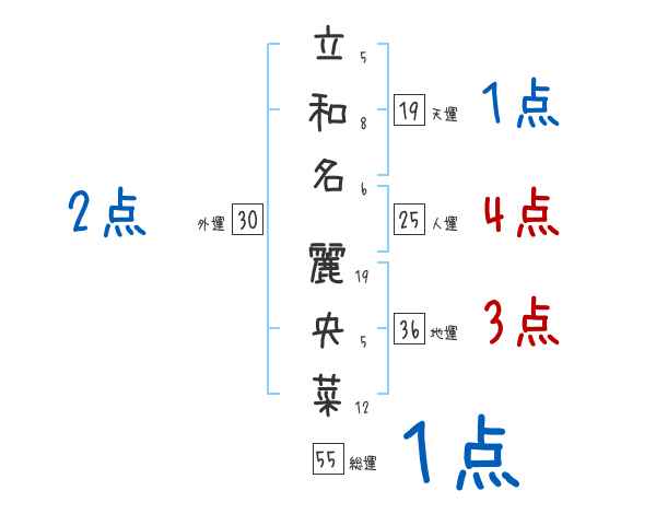 天運![]() | 立和名麗央菜さんの天運は19画の1つ星!優れた才能を持ちますが、協調性が足りないことも。周りの人と協力する事を意識しましょう。 家系が持つ宿命的な運勢を表します。祖先から受け継いだ苗字ですので自分の力が及びません。家柄を象徴します。 |