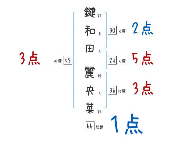 外運![]() | 鍵和田麗央菜さんの外運は42画の3つ星!病気に注意。多芸であるが消極的でおとなしい。 生活面を象徴する運勢です。外部から受ける影響力を表し、結婚運、家庭運や職場、環境への順応性を表します。 |