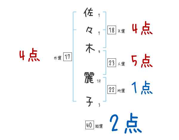 外運![]() | 佐々木麗子さんの外運は17画の4つ星!積極的な行動力。地位を気づき財産を手に入れる。純粋な心と直感力。 生活面を象徴する運勢です。外部から受ける影響力を表し、結婚運、家庭運や職場、環境への順応性を表します。 |