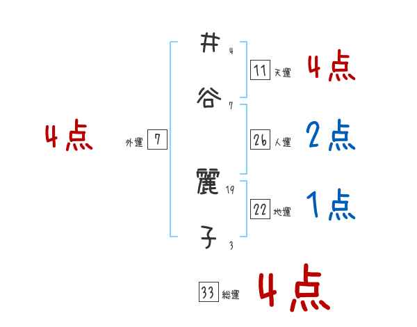 天運![]() | 井谷麗子さんの天運は11画の4つ星!着実に富や地位を得る幸運な人生。 家系が持つ宿命的な運勢を表します。祖先から受け継いだ苗字ですので自分の力が及びません。家柄を象徴します。 |