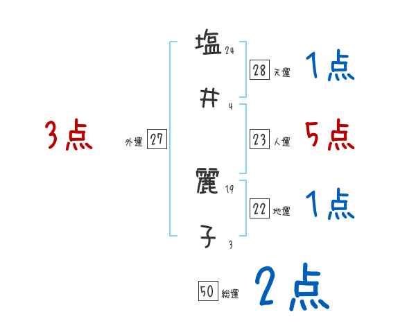 総運![]() | 塩井麗子さんの総運は50画の2つ星!浮き沈みが激しく不安定。しりすぼみに衰退しやすいので注意しましょう。 あなたの人生を表す1番重要な運勢です。生涯を通じて影響する総合運となり、主に50歳以降の晩年期に影響を及ぼします。 |