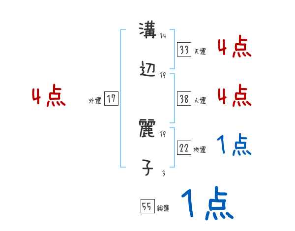 外運![]() | 溝辺麗子さんの外運は17画の4つ星!積極的な行動力。地位を気づき財産を手に入れる。純粋な心と直感力。 生活面を象徴する運勢です。外部から受ける影響力を表し、結婚運、家庭運や職場、環境への順応性を表します。 |