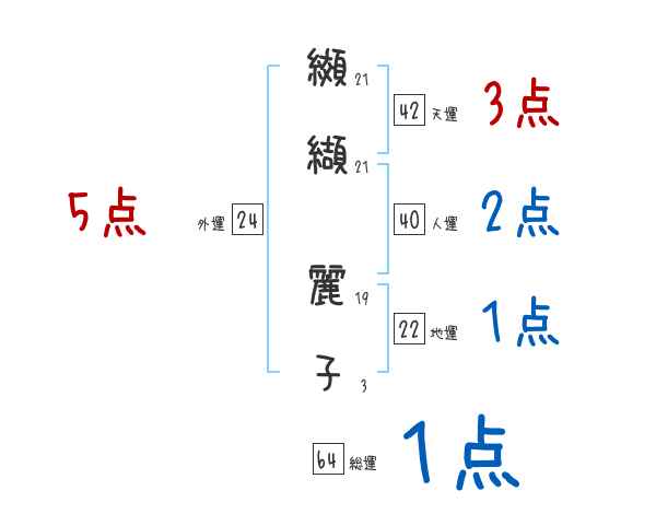 地運![]() | 纐纈麗子さんの地運は22画の1つ星!努力することが苦手ないっぽう手先が器用。芸術性にも優れる。 個性を表す基礎的な運勢です。性格形成や対人関係、行動力など家庭環境に影響されます。主に誕生してから20歳くらいまでの若年期の運勢を表します。 |