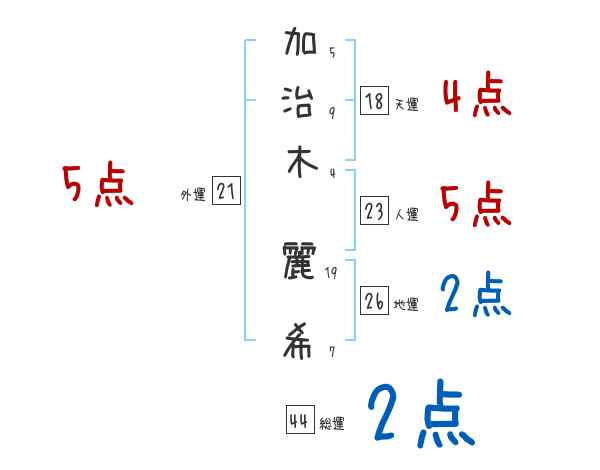 天運![]() | 加治木麗希さんの天運は18画の4つ星!情熱的で剛気。忍耐力があり信頼される。 家系が持つ宿命的な運勢を表します。祖先から受け継いだ苗字ですので自分の力が及びません。家柄を象徴します。 |