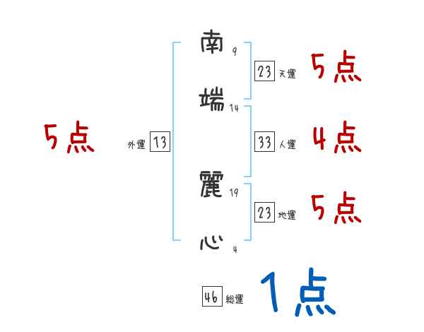 天運![]() | 南端麗心さんの天運は23画の5つ星!想像力に優れ活力がある。一代で成功し名誉を手に入れる。 家系が持つ宿命的な運勢を表します。祖先から受け継いだ苗字ですので自分の力が及びません。家柄を象徴します。 |