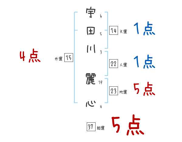 天運![]() | 宇田川麗心さんの天運は14画の1つ星!人に対して優しいがストレスを溜め込みがち。人間関係のトラブルを避けるよう気をつけましょう。 家系が持つ宿命的な運勢を表します。祖先から受け継いだ苗字ですので自分の力が及びません。家柄を象徴します。 |