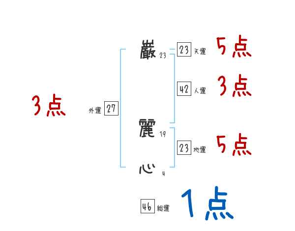 天運![]() | 巌麗心さんの天運は23画の5つ星!想像力に優れ活力がある。一代で成功し名誉を手に入れる。 家系が持つ宿命的な運勢を表します。祖先から受け継いだ苗字ですので自分の力が及びません。家柄を象徴します。 |