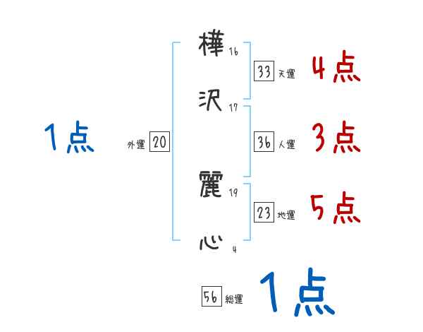 天運![]() | 樺沢麗心さんの天運は33画の4つ星!権力志向でプライドが高い。勇気があり運を切り開き成功する。 家系が持つ宿命的な運勢を表します。祖先から受け継いだ苗字ですので自分の力が及びません。家柄を象徴します。 |