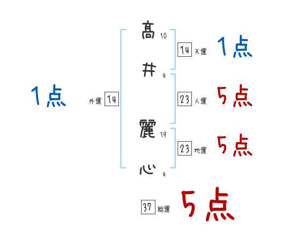 人運![]() | 髙井麗心さんの人運は23画の5つ星!想像力に優れ活力がある。一代で成功し名誉を手に入れる。 性格や才能などを表す2番目に重要な運勢です。人間関係や協調性、社会的な成功に影響します。主に20歳から50歳ぐらいまでの中年期の運勢を表します。 |