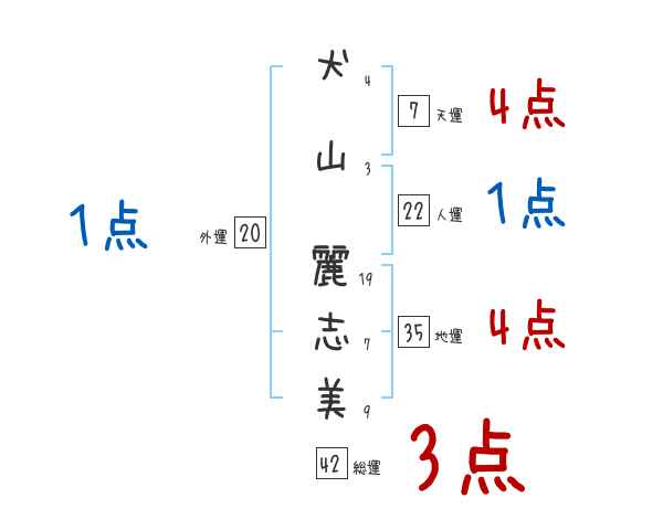 天運![]() | 犬山麗志美さんの天運は7画の4つ星!強い意志や信念を持ち独立心が強い。自立する。 家系が持つ宿命的な運勢を表します。祖先から受け継いだ苗字ですので自分の力が及びません。家柄を象徴します。 |