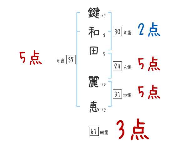 天運![]() | 鍵和田麗恵さんの天運は30画の2つ星!浮き沈みの激しさに注意しましょう。 家系が持つ宿命的な運勢を表します。祖先から受け継いだ苗字ですので自分の力が及びません。家柄を象徴します。 |