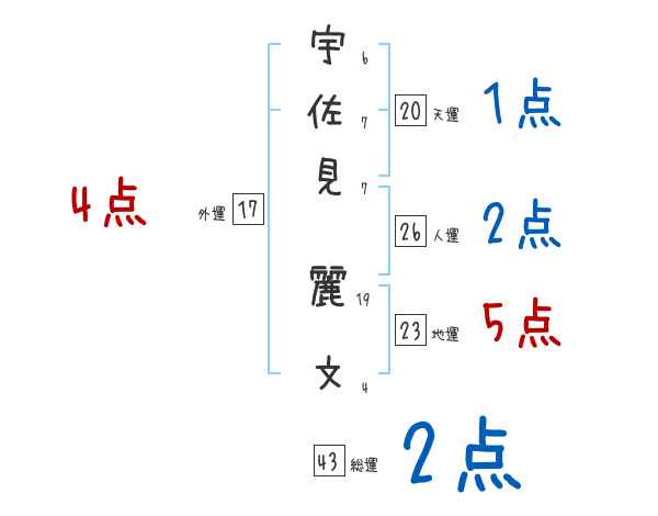 外運![]() | 宇佐見麗文さんの外運は17画の4つ星!積極的な行動力。地位を気づき財産を手に入れる。純粋な心と直感力。 生活面を象徴する運勢です。外部から受ける影響力を表し、結婚運、家庭運や職場、環境への順応性を表します。 |