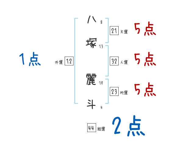 天運![]() | 八塚麗斗さんの天運は21画の5つ星!統率力がある。独立し成功する。名誉を手に入れる。 家系が持つ宿命的な運勢を表します。祖先から受け継いだ苗字ですので自分の力が及びません。家柄を象徴します。 |