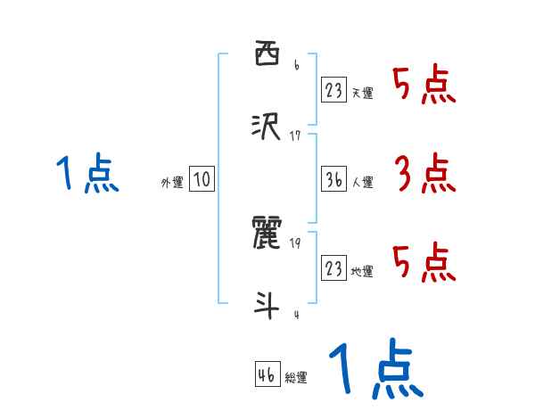 天運![]() | 西沢麗斗さんの天運は23画の5つ星!想像力に優れ活力がある。一代で成功し名誉を手に入れる。 家系が持つ宿命的な運勢を表します。祖先から受け継いだ苗字ですので自分の力が及びません。家柄を象徴します。 |