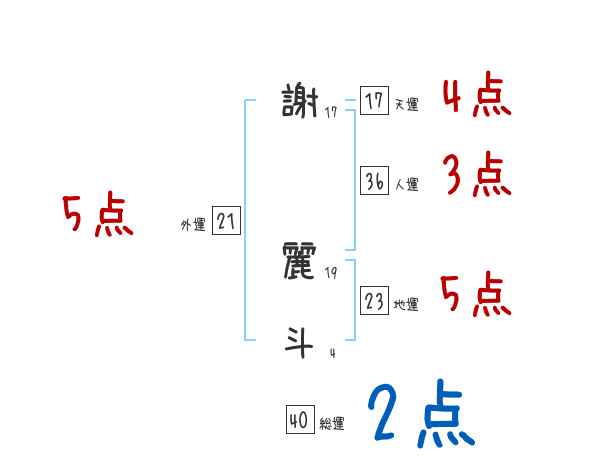総運![]() | 謝麗斗さんの総運は40画の2つ星!自信過剰で物事に固執するためトラブルに注意。 あなたの人生を表す1番重要な運勢です。生涯を通じて影響する総合運となり、主に50歳以降の晩年期に影響を及ぼします。 |