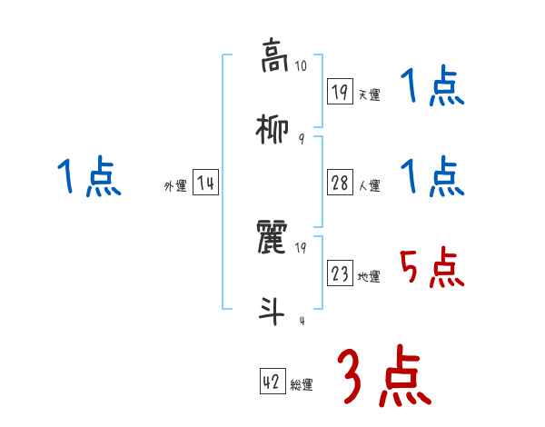 天運![]() | 高柳麗斗さんの天運は19画の1つ星!優れた才能を持ちますが、協調性が足りないことも。周りの人と協力する事を意識しましょう。 家系が持つ宿命的な運勢を表します。祖先から受け継いだ苗字ですので自分の力が及びません。家柄を象徴します。 |