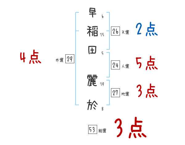 総運![]() | 早稲田麗於さんの総運は53画の3つ星!やや見栄っ張りで虚栄心がある。散財に注意。 あなたの人生を表す1番重要な運勢です。生涯を通じて影響する総合運となり、主に50歳以降の晩年期に影響を及ぼします。 |
