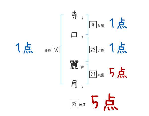 総運![]() | 寺口麗月さんの総運は32画の5つ星!柔軟性があり成功する。チャンスが多く金運が良い。 あなたの人生を表す1番重要な運勢です。生涯を通じて影響する総合運となり、主に50歳以降の晩年期に影響を及ぼします。 |