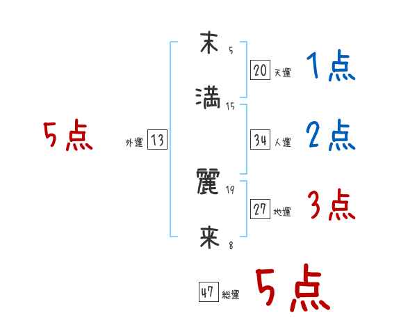 天運![]() | 末満麗来さんの天運は20画の1つ星!社交が苦手。人とは違った才能があり波乱万丈な人生かも。 家系が持つ宿命的な運勢を表します。祖先から受け継いだ苗字ですので自分の力が及びません。家柄を象徴します。 |