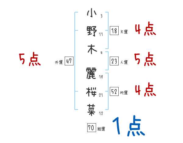 外運![]() | 小野木麗桜菜さんの外運は47画の5つ星!実力が開花し発展する円満な人生。財に恵まれる。 生活面を象徴する運勢です。外部から受ける影響力を表し、結婚運、家庭運や職場、環境への順応性を表します。 |