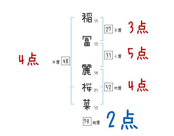 総運![]() | 稲冨麗桜菜さんの総運は79画の2つ星!消極的な性格で不振に終わることが多い。不安定にならないように気をつけましょう。 あなたの人生を表す1番重要な運勢です。生涯を通じて影響する総合運となり、主に50歳以降の晩年期に影響を及ぼします。 |