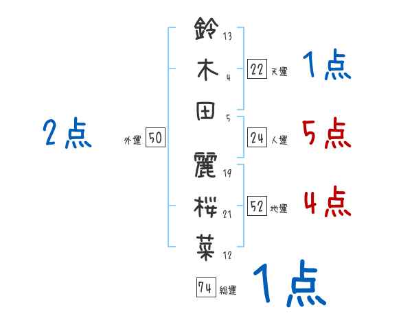 外運![]() | 鈴木田麗桜菜さんの外運は50画の2つ星!浮き沈みが激しく不安定。しりすぼみに衰退しやすいので注意しましょう。 生活面を象徴する運勢です。外部から受ける影響力を表し、結婚運、家庭運や職場、環境への順応性を表します。 |
