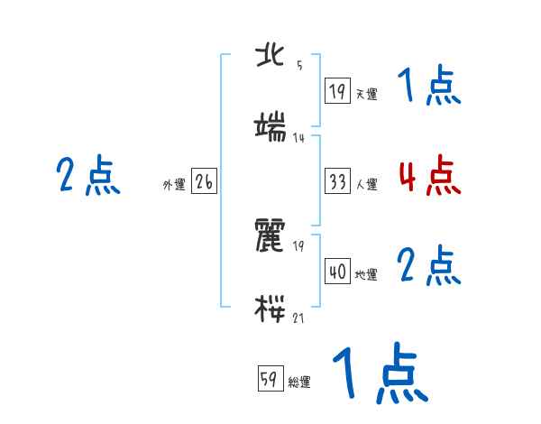 総運![]() | 北端麗桜さんの総運は59画の1つ星!意志の弱さであきらめることが多いかも。粘り強さが必要。 あなたの人生を表す1番重要な運勢です。生涯を通じて影響する総合運となり、主に50歳以降の晩年期に影響を及ぼします。 |