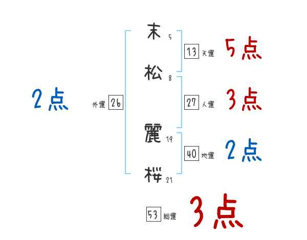 総運![]() | 末松麗桜さんの総運は53画の3つ星!やや見栄っ張りで虚栄心がある。散財に注意。 あなたの人生を表す1番重要な運勢です。生涯を通じて影響する総合運となり、主に50歳以降の晩年期に影響を及ぼします。 |