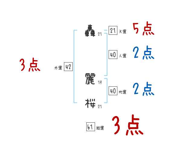 天運![]() | 轟麗桜さんの天運は21画の5つ星!統率力がある。独立し成功する。名誉を手に入れる。 家系が持つ宿命的な運勢を表します。祖先から受け継いだ苗字ですので自分の力が及びません。家柄を象徴します。 |