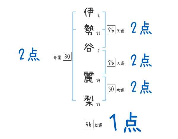 天運![]() | 伊勢谷麗梨さんの天運は26画の2つ星!波瀾万丈かも。信頼できる人を大事にしましょう。 家系が持つ宿命的な運勢を表します。祖先から受け継いだ苗字ですので自分の力が及びません。家柄を象徴します。 |