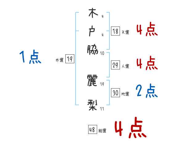 天運![]() | 木戸脇麗梨さんの天運は18画の4つ星!情熱的で剛気。忍耐力があり信頼される。 家系が持つ宿命的な運勢を表します。祖先から受け継いだ苗字ですので自分の力が及びません。家柄を象徴します。 |