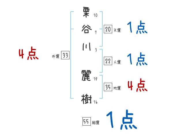 外運![]() | 栗谷川麗樹さんの外運は33画の4つ星!権力志向でプライドが高い。勇気があり運を切り開き成功する。 生活面を象徴する運勢です。外部から受ける影響力を表し、結婚運、家庭運や職場、環境への順応性を表します。 |