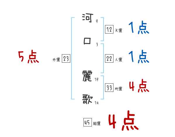 天運![]() | 河口麗歌さんの天運は12画の1つ星!簡単な失敗で諦めてしまいやすいかも。着実に行動すると良いでしょう。 家系が持つ宿命的な運勢を表します。祖先から受け継いだ苗字ですので自分の力が及びません。家柄を象徴します。 |