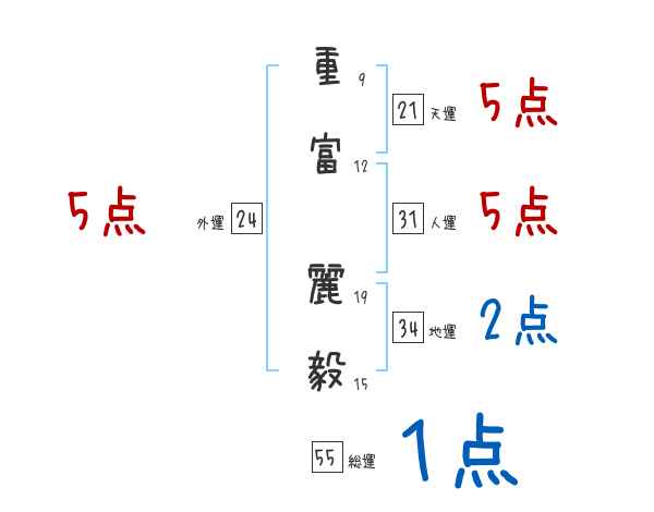 外運![]() | 重富麗毅さんの外運は24画の5つ星!家庭運が良く順調な人生。金運にも恵まれる。 生活面を象徴する運勢です。外部から受ける影響力を表し、結婚運、家庭運や職場、環境への順応性を表します。 |