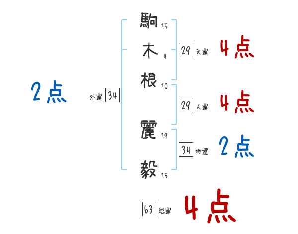 総運![]() | 駒木根麗毅さんの総運は63画の4つ星!家庭運がよく順調な生活。温和な性格。 あなたの人生を表す1番重要な運勢です。生涯を通じて影響する総合運となり、主に50歳以降の晩年期に影響を及ぼします。 |