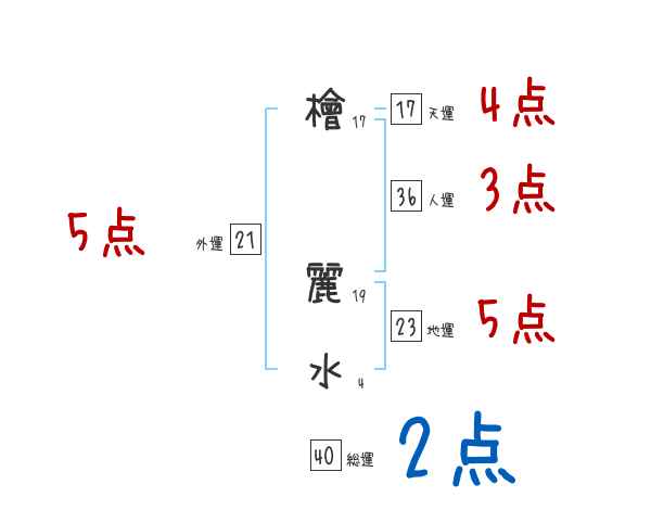 地運![]() | 檜麗水さんの地運は23画の5つ星!想像力に優れ活力がある。一代で成功し名誉を手に入れる。 個性を表す基礎的な運勢です。性格形成や対人関係、行動力など家庭環境に影響されます。主に誕生してから20歳くらいまでの若年期の運勢を表します。 |