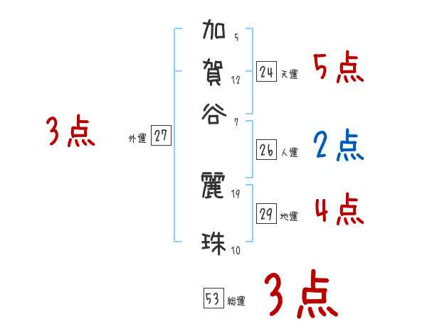 総運![]() | 加賀谷麗珠さんの総運は53画の3つ星!やや見栄っ張りで虚栄心がある。散財に注意。 あなたの人生を表す1番重要な運勢です。生涯を通じて影響する総合運となり、主に50歳以降の晩年期に影響を及ぼします。 |