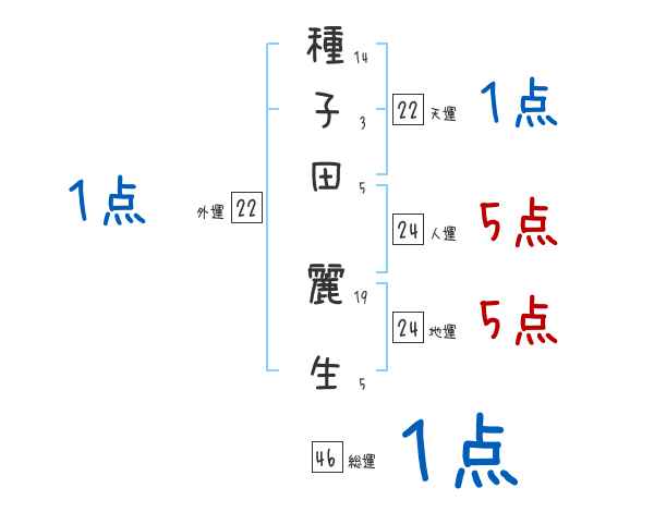 外運![]() | 種子田麗生さんの外運は22画の1つ星!努力することが苦手ないっぽう手先が器用。芸術性にも優れる。 生活面を象徴する運勢です。外部から受ける影響力を表し、結婚運、家庭運や職場、環境への順応性を表します。 |
