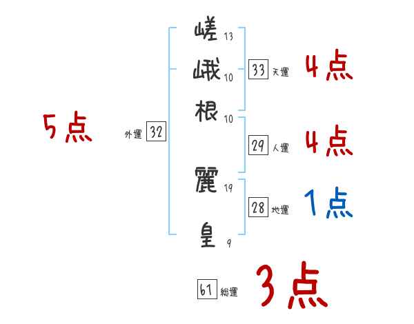 外運![]() | 嵯峨根麗皇さんの外運は32画の5つ星!柔軟性があり成功する。チャンスが多く金運が良い。 生活面を象徴する運勢です。外部から受ける影響力を表し、結婚運、家庭運や職場、環境への順応性を表します。 |