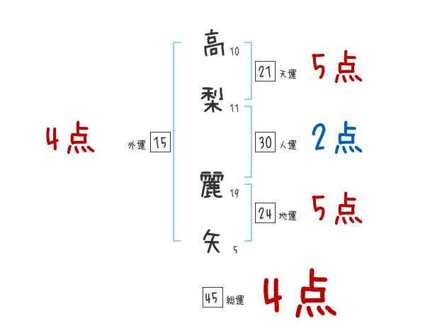 天運![]() | 高梨麗矢さんの天運は21画の5つ星!統率力がある。独立し成功する。名誉を手に入れる。 家系が持つ宿命的な運勢を表します。祖先から受け継いだ苗字ですので自分の力が及びません。家柄を象徴します。 |
