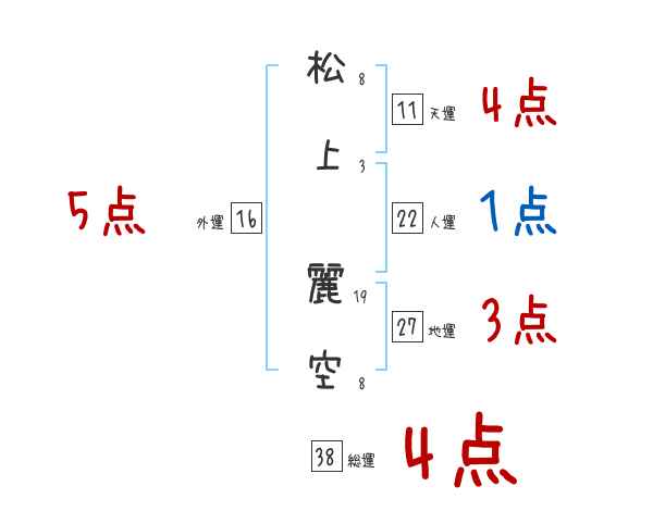 外運![]() | 松上麗空さんの外運は16画の5つ星!人望が厚く大きく発展する。逆転成功が見える。 生活面を象徴する運勢です。外部から受ける影響力を表し、結婚運、家庭運や職場、環境への順応性を表します。 |