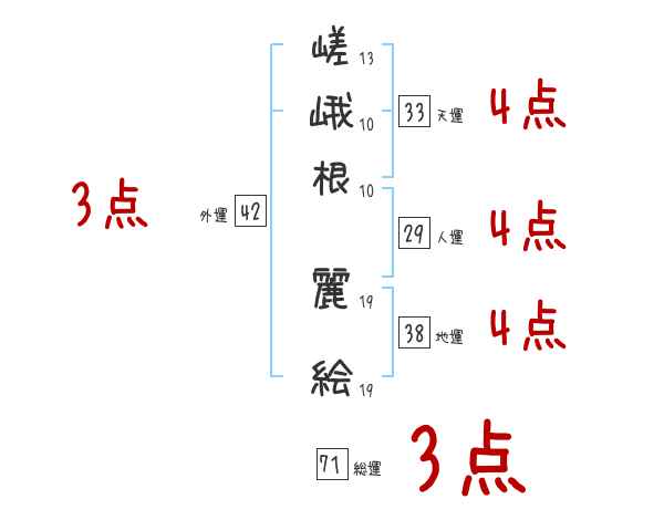 天運![]() | 嵯峨根麗絵さんの天運は33画の4つ星!権力志向でプライドが高い。勇気があり運を切り開き成功する。 家系が持つ宿命的な運勢を表します。祖先から受け継いだ苗字ですので自分の力が及びません。家柄を象徴します。 |