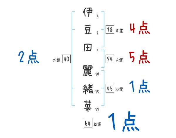 天運![]() | 伊豆田麗緒菜さんの天運は18画の4つ星!情熱的で剛気。忍耐力があり信頼される。 家系が持つ宿命的な運勢を表します。祖先から受け継いだ苗字ですので自分の力が及びません。家柄を象徴します。 |
