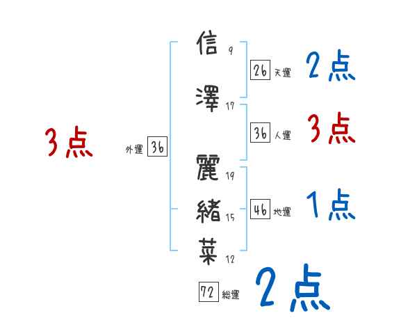 外運![]() | 信澤麗緒菜さんの外運は36画の3つ星!先見性が豊かです。多少神経質で苦労することも。 生活面を象徴する運勢です。外部から受ける影響力を表し、結婚運、家庭運や職場、環境への順応性を表します。 |