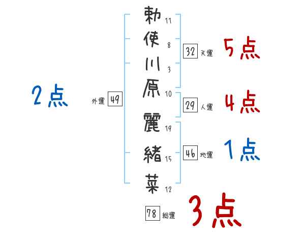天運![]() | 勅使川原麗緒菜さんの天運は32画の5つ星!柔軟性があり成功する。チャンスが多く金運が良い。 家系が持つ宿命的な運勢を表します。祖先から受け継いだ苗字ですので自分の力が及びません。家柄を象徴します。 |