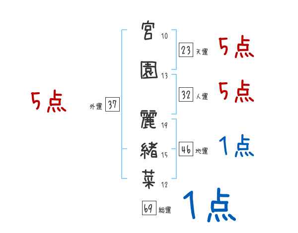 人運![]() | 宮園麗緒菜さんの人運は32画の5つ星!柔軟性があり成功する。チャンスが多く金運が良い。 性格や才能などを表す2番目に重要な運勢です。人間関係や協調性、社会的な成功に影響します。主に20歳から50歳ぐらいまでの中年期の運勢を表します。 |