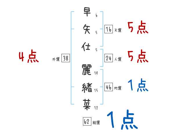 地運![]() | 早矢仕麗緒菜さんの地運は46画の1つ星!迷走することが多く苦労するかも。目先のことにとらわれないように。 個性を表す基礎的な運勢です。性格形成や対人関係、行動力など家庭環境に影響されます。主に誕生してから20歳くらいまでの若年期の運勢を表します。 |