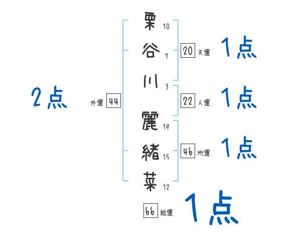 人運![]() | 栗谷川麗緒菜さんの人運は22画の1つ星!努力することが苦手ないっぽう手先が器用。芸術性にも優れる。 性格や才能などを表す2番目に重要な運勢です。人間関係や協調性、社会的な成功に影響します。主に20歳から50歳ぐらいまでの中年期の運勢を表します。 |