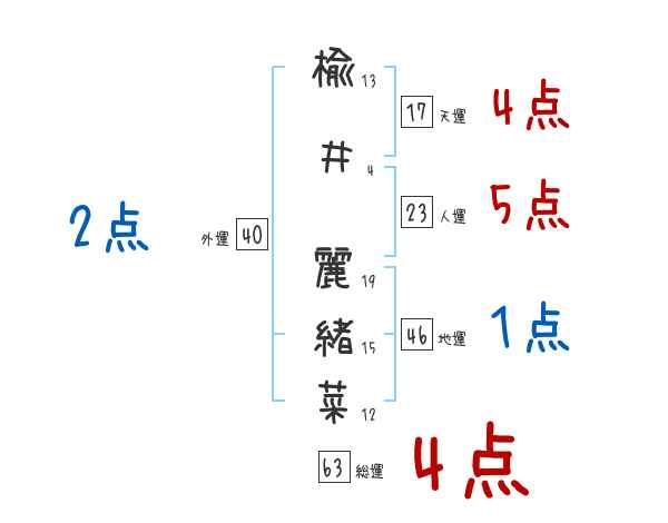 人運![]() | 楡井麗緒菜さんの人運は23画の5つ星!想像力に優れ活力がある。一代で成功し名誉を手に入れる。 性格や才能などを表す2番目に重要な運勢です。人間関係や協調性、社会的な成功に影響します。主に20歳から50歳ぐらいまでの中年期の運勢を表します。 |